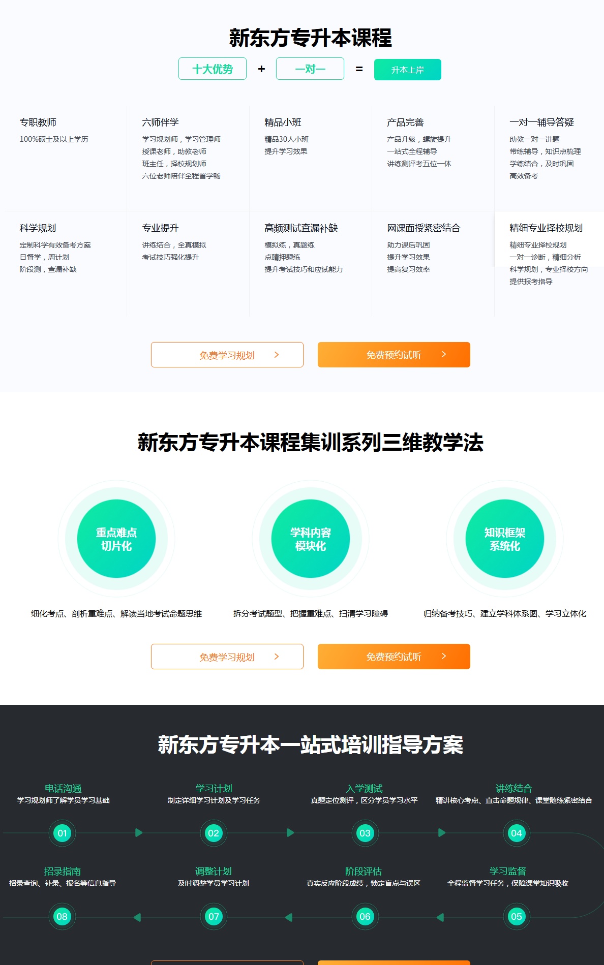 1.五阶三轮精细化课程设置,多轮滚动学习,覆盖专升本考点。 2.雄厚师资力量:新东方全职教师多年升本教学经验 3.基础差适用,合理备考周期,学习科目科学排布,完善的教学体系。3.周末走读+封闭集训相结合,课程+督学+服务备考